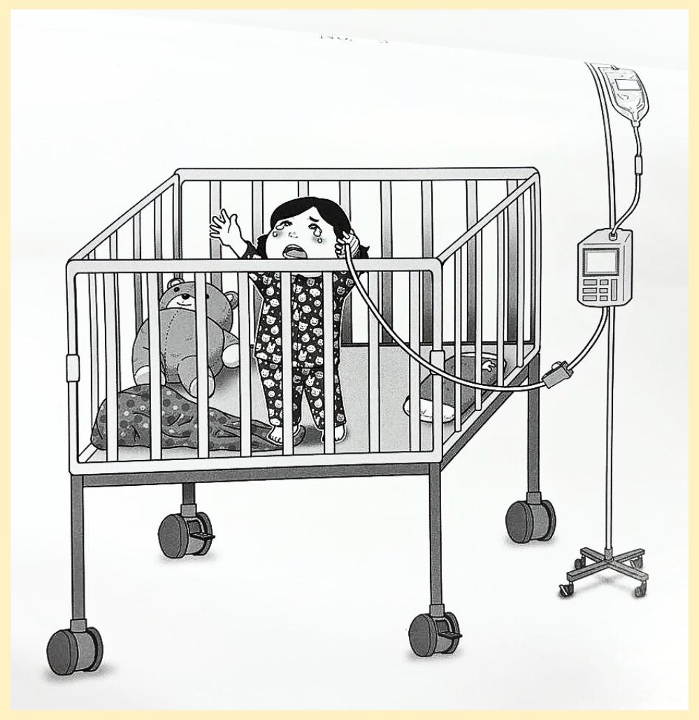 Aちゃんは、腹部エックス線撮影で胃内にボタン型電池が認められ、全身麻酔下での内視鏡でボタン型電池を摘出し、消化管粘膜に大きな問題はなかった。摘出後、小児病棟に1泊入院した。小児病棟に入院1時間後、看護師が訪室するとAちゃんは覚醒しており、図(別冊No.3)のように「ママー、ママー」と言いながら大声で泣き、ベッドから両親の方に手を伸ばしている。両親は戸惑った様子で、ベッドの傍に立っている。