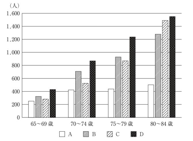 日本の令和3年(2021年)の人口動態統計に基づく、65歳以上85歳未満における不慮の事故による死亡状況をグラフに示す。